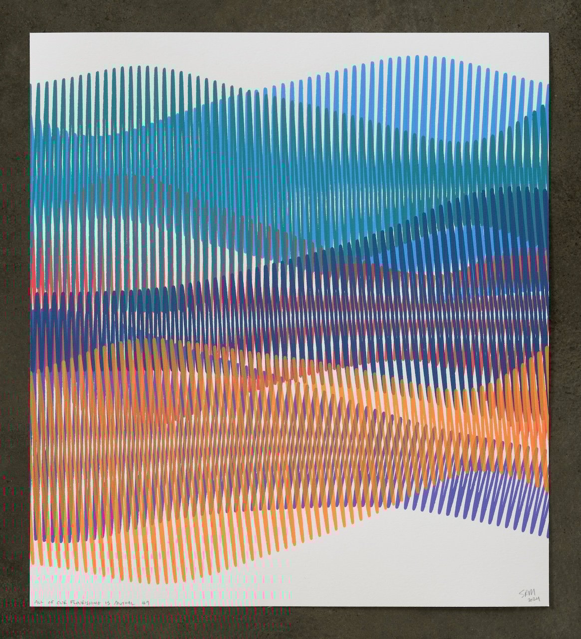 My works are serial in nature. They are the physical manifestations of the generative programs I create. There is a unique partnership, a transference of powers, when bits of information become paint on paper. Numerous line forms layer atop of each other, producing moirΓ© interference patterns: the emergent properties of shape and color, paint and paper.